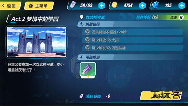1、点击进入之后,我们可以看到每一关的挑战目标以及可能掉落的装备,另外需要提到的是,每次进入都需要消耗我们的体(节)力(操)哦。