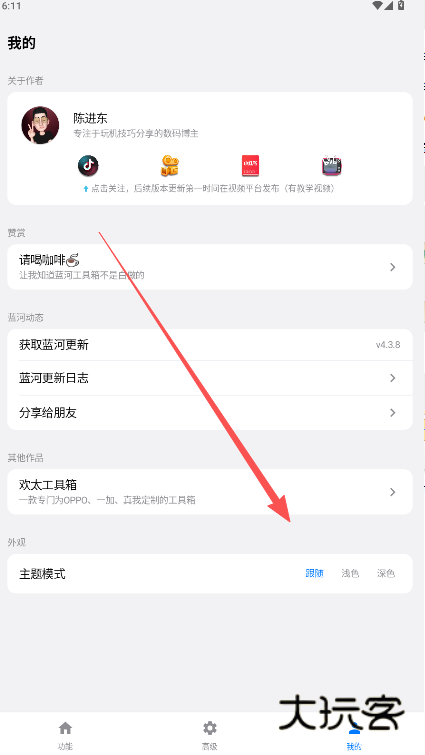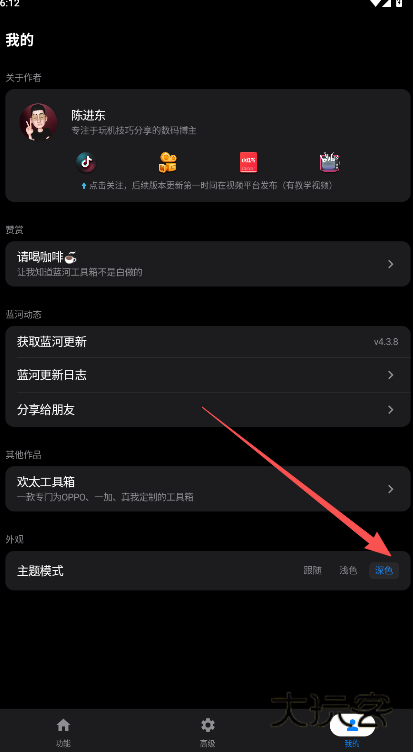 1、更改主题可在我的主页中完成,默认选项是跟随系统。