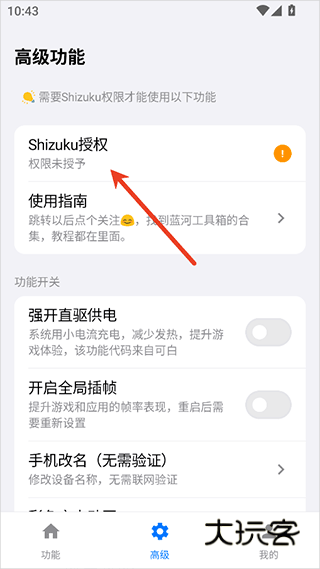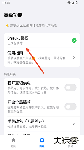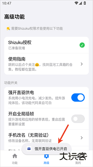 2、而像强开直驱供电功能需要用户使用Shizuku授权激活使用。
