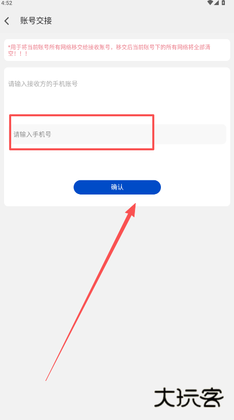 3、输入对方用于交接的手机号码,用于将当前账号所有网络移交给接收账号,移交后当前账号下的所有网络将全部清空。
