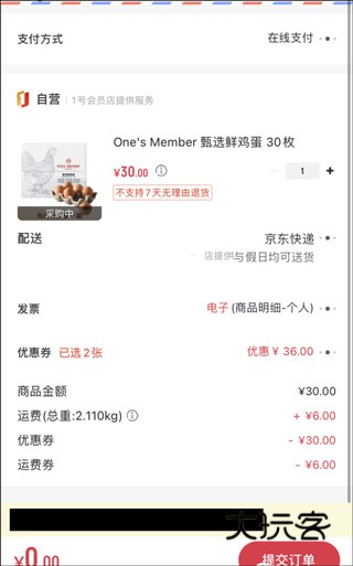 然后点击“+”将鸡蛋放入购物车中,接着点击购物车去结算,提交订单页面会自动带出一张6元的运费券,实际支付金额为0元