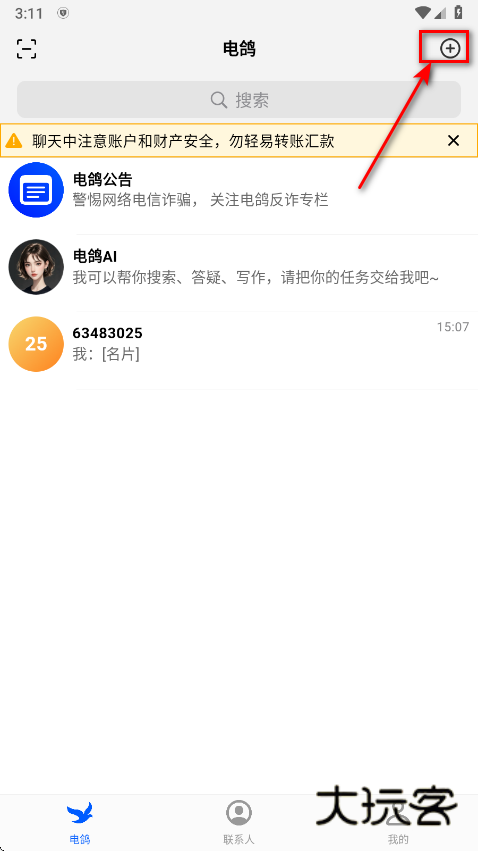 1、首先你需要在花灯下载网下载安装电鸽app并打开,进入首页后点击右上角的“+”号。