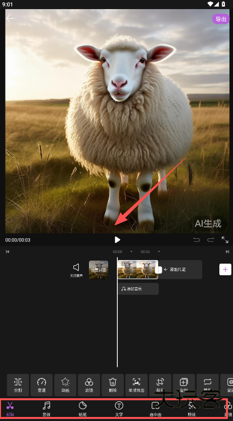 4、像使用美图秀秀等编辑工具那样,对它的整体效果进行编辑制作,包括剪辑效果以及各项成片效果预览等。