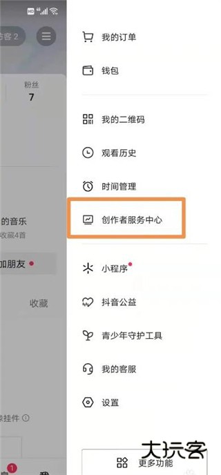 1、打开抖音APP,点击底部菜单栏“我”,在右上角找到三横的图标,然后点击创作者服务中心;