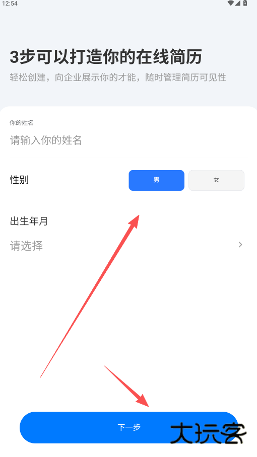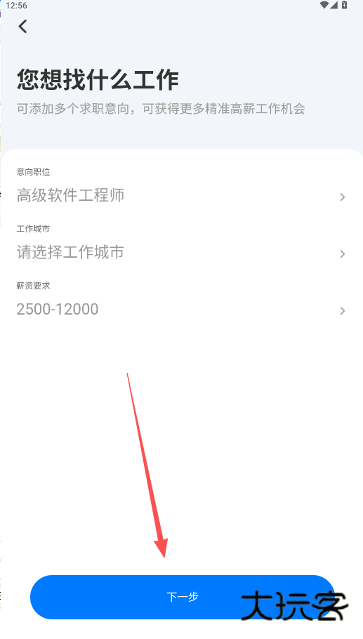 4、选择你的性别,当前是离职还是在职并确定好的你的求职类型,以便更好的给到你相关岗位推送。