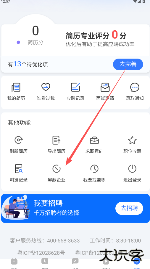 1、俊才网使用者分为求职者和公司招聘两个使用界面,要实现屏蔽公司的操作,请点击“我要找工作”。