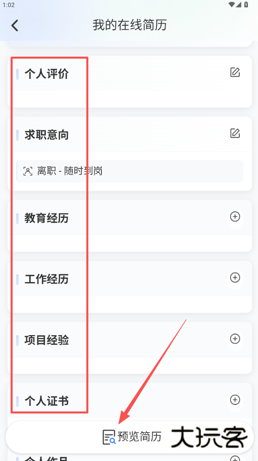 2、具体到个人评价、求职意向、教育经理、工作经历、个人证书以及个人作品等内容信息部分,都要去补充完整。