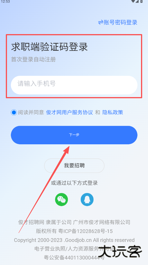 2、首次登录,输入手机号码即为自动注册完成验证。