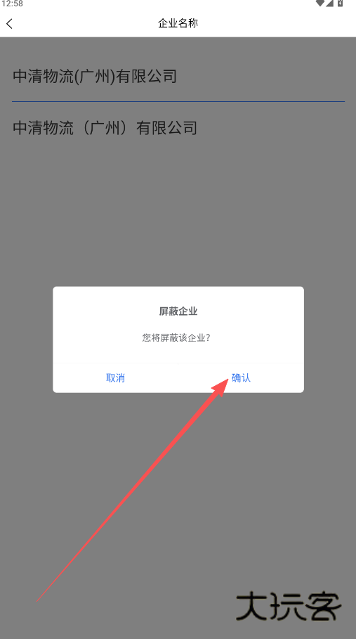 7、输入企业名称,搜索栏会为你完成匹配,点击“确定”屏蔽。