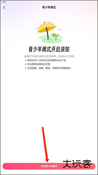3、打开后,在最下方点击【开启青少年模式】即可完成设置。