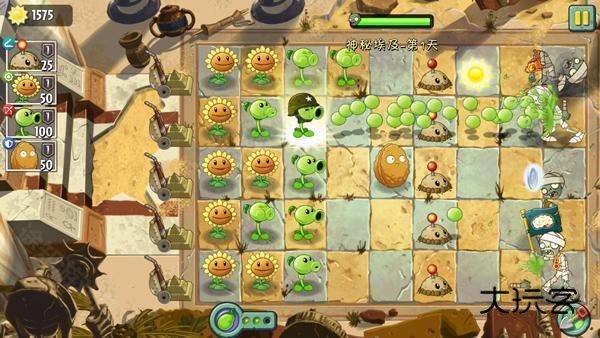 游戏的开始:前面出现的几个僵尸非常容易解决,土豆雷分分钟就可以拖至挺久的,这边要在第2和4种植火葫芦,当火把僵尸靠近的时候,直接操控火葫芦攻击,可以秒杀它。