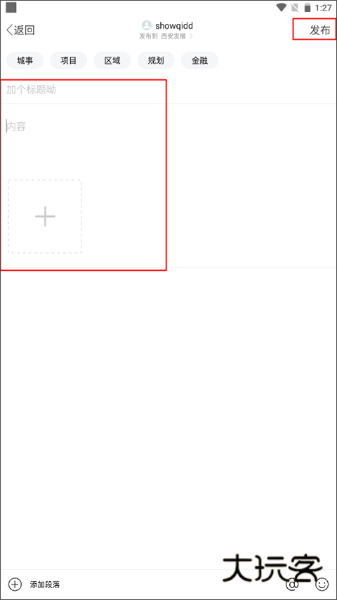 3、给自己的帖子添加一个标题,填写具体的城市建议内容,上传对应的照片,最后点击右上角的发布按钮即可。