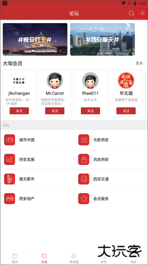 1、进入到【论坛】界面,在这里你会看到很多的大咖会员、论坛专题以及各种热门话题等,点击右上角的“+”;