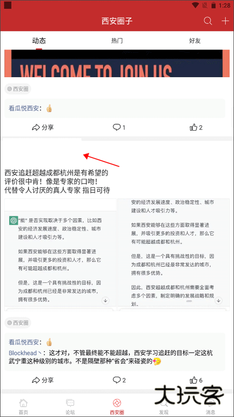 1、在【西安圈】中你可以看到动态信息、热门话题以及好友信息,选择其中一个用户并点进去;