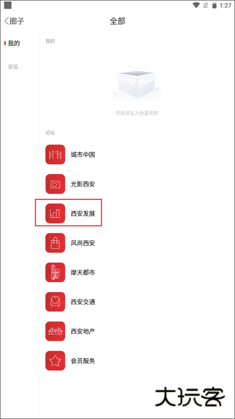 2、在圈子这个页面中,分为了我的和论坛两个区域,选择右边的“西安城市”专题;