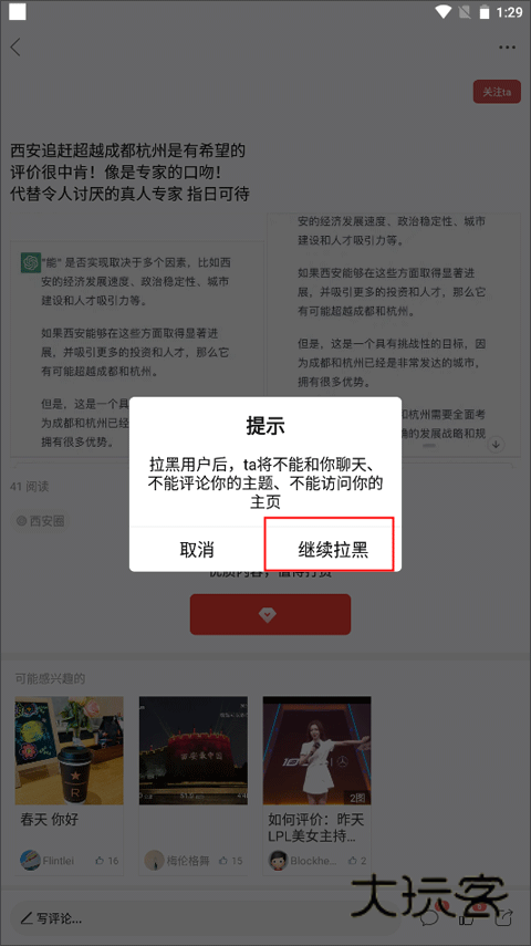 3、这时还会给你一个提示:“拉黑用户后,ta将不能和你聊天、不能评论你的主题、不能访问你的主页”,最后点击“继续拉黑”,后面ta不管发什么动态你都看不到了。