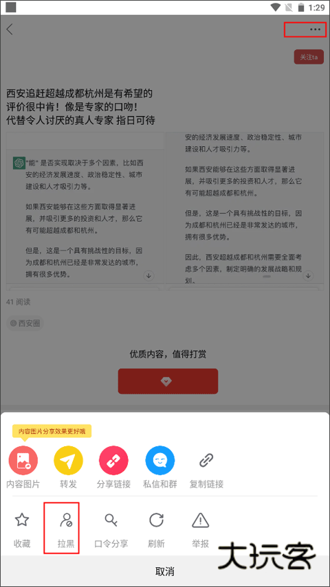 2、如果想要拉黑,就可以点击右上角的“…”图标,选择下方窗口中的“拉黑”操作;