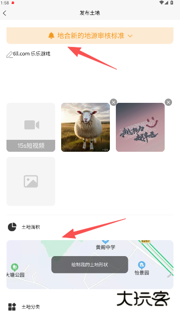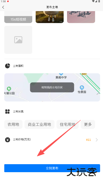 3、在土地出租的发布页面,添加土地相关信息:土地名称、土地面积、土地图片、视频描述以及土地分类等信息,点击立即发布。