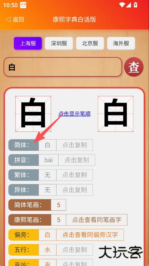 3、点击单个汉字,查看该字的简体、拼音等详细信息。