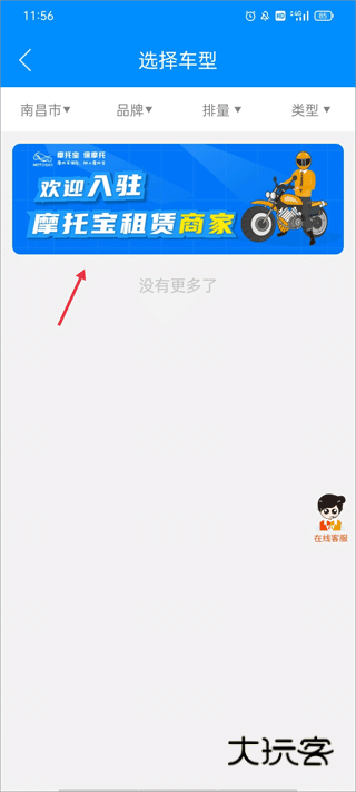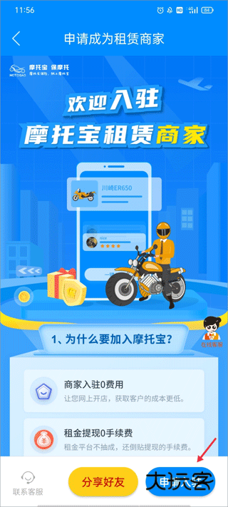 2、会看到有一个通告:欢迎入驻,摩托车宝租赁商家,点击进入里面。