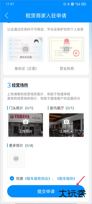 4、填写自己作为商家的相关信息,以及上传营业执照、经营场所等信息,最后“提交申请”就可以了,只要等系统审核通过之后就能成为租赁商家了。