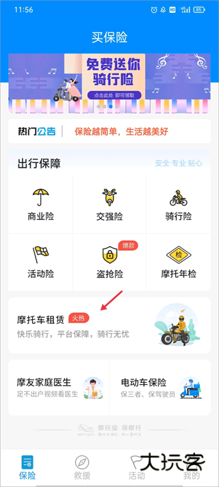 1、注册并绑定微信之后,默认进入到【保险】页面,点击上面的“摩托车租赁”。