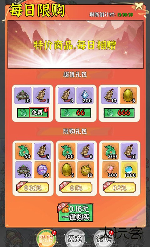5、游戏内还有各种限购礼包,都能使用0.1折福利进行购买,还有免费礼包可以领取哦!