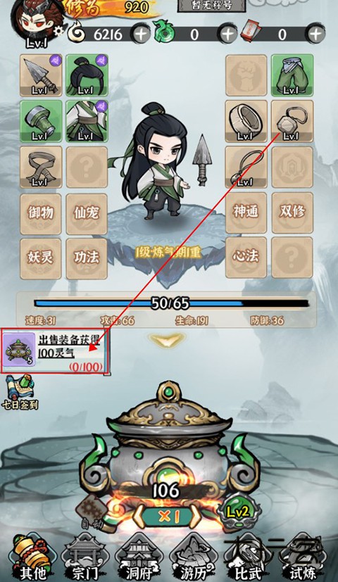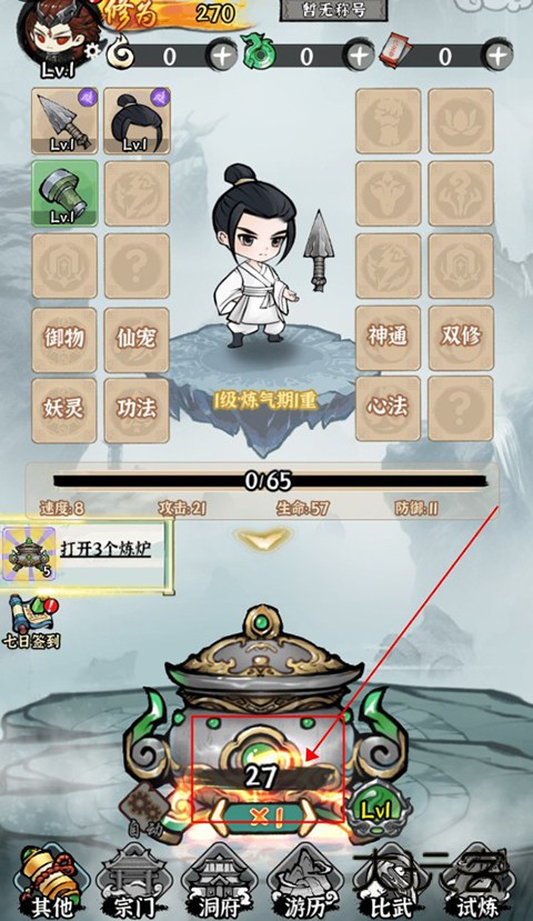 1、进入仙域轮回游戏后,玩家可以打开面前的炼炉获得装备