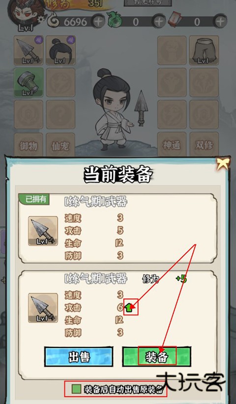 玩家在开箱的时候会获得相同的装备,这些装备的效果不同,有的品质更高,需要玩家进行切换。玩家可以查看装备对比,如果是绿色箭头就可以直接切换装备,然后将下方的“装备后自动出售原装备”勾上,这样低级装备就会自动出售啦!