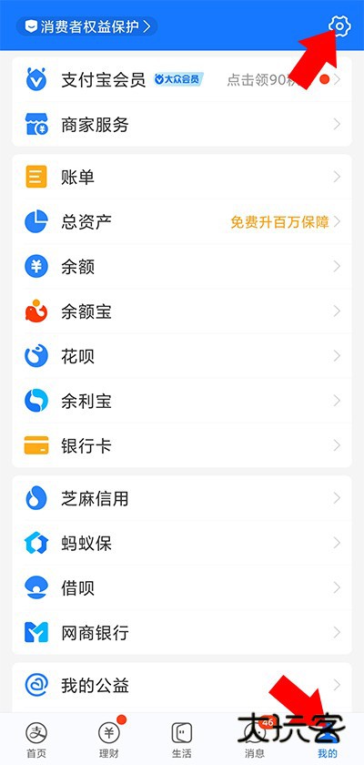 1、首先打开【支付宝】客户端,然后点击右下角【我的】,点击右上角【设置】图标