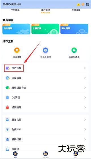 1、打开360清理大师的主界面,滑动至推荐工具的下方,你就可以看到照片恢复功能了。