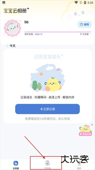 2、进入【宝宝云相册】页面,可点击【立即记录】记录宝宝成长,还能查看云相册容量等信息。