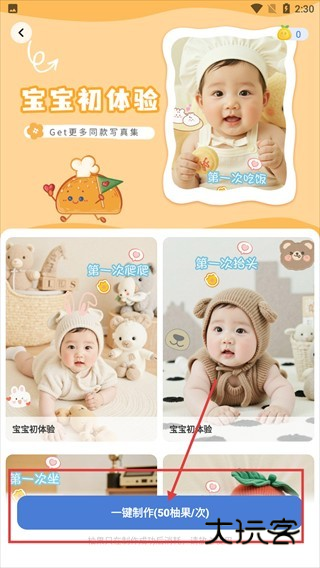 4、进入【宝宝初体验】写真集页面,选择喜欢的宝宝场景模板后,点击【一键制作(50结果/次)】生成写真。
