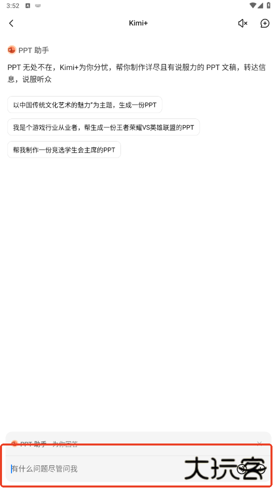 4.你可以在下方对话框中输入你的ppt页面需求。等待kimi回复。