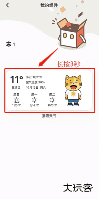 2、进入我的组件界面后,长按【猫猫天气组件】5秒
