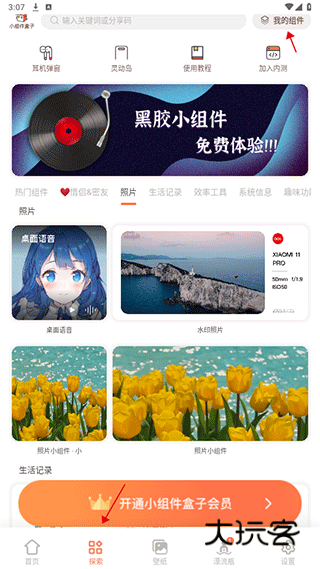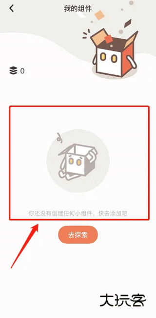 1、首先打开小组件盒子的探索界面,点击右上角的【我的组件】