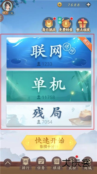2、联机对战:无需注册即可即时匹配全国棋友,随机对弈更具未知性,每一盘都可能遇见旗鼓相当的对手。