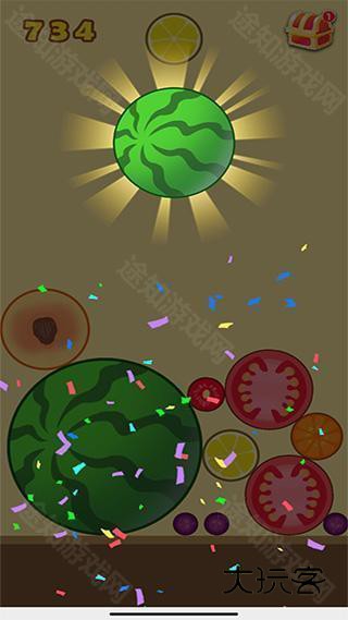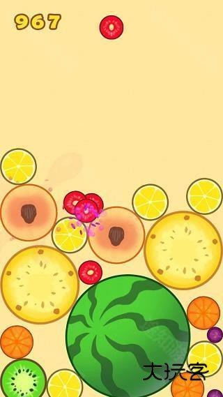 2、一开始玩建议大家有序的排列水果,遵从一个角落水果最大,越往外水果越小的感觉(类似2048),这样容易产生连续合成而节约空间。而且一旦大水果在中间很容易堆太高导致游戏失败。