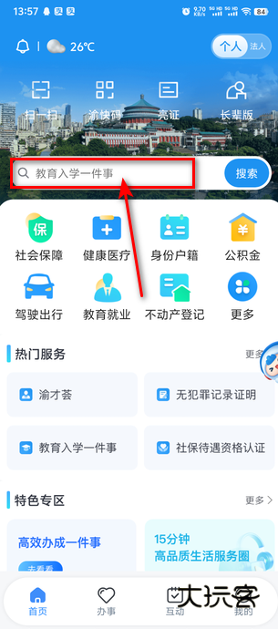 1、下载安装渝快办app,打开软件进入首页,点击下方办事按钮