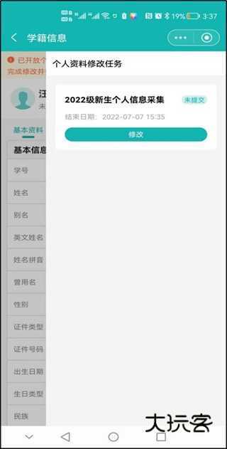 打开app,在待完成任务区域,找到“2022新生个人信息采集”,点击进入修改。