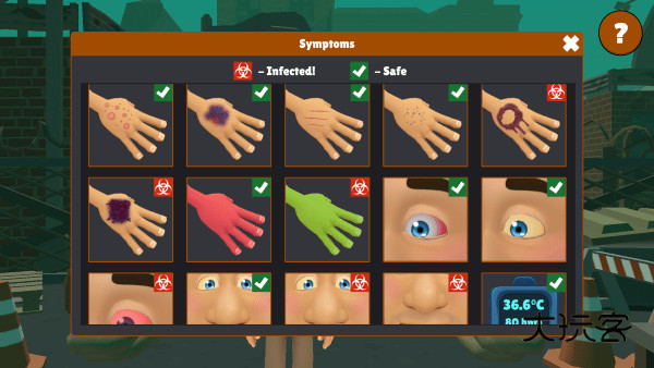 6、用温度仪对准避难者,屏幕会显示其体温与脉搏,若出现 > 45 摄氏度且 < 50bpm 的数值,即为病毒感染者,其他数值则为正常。