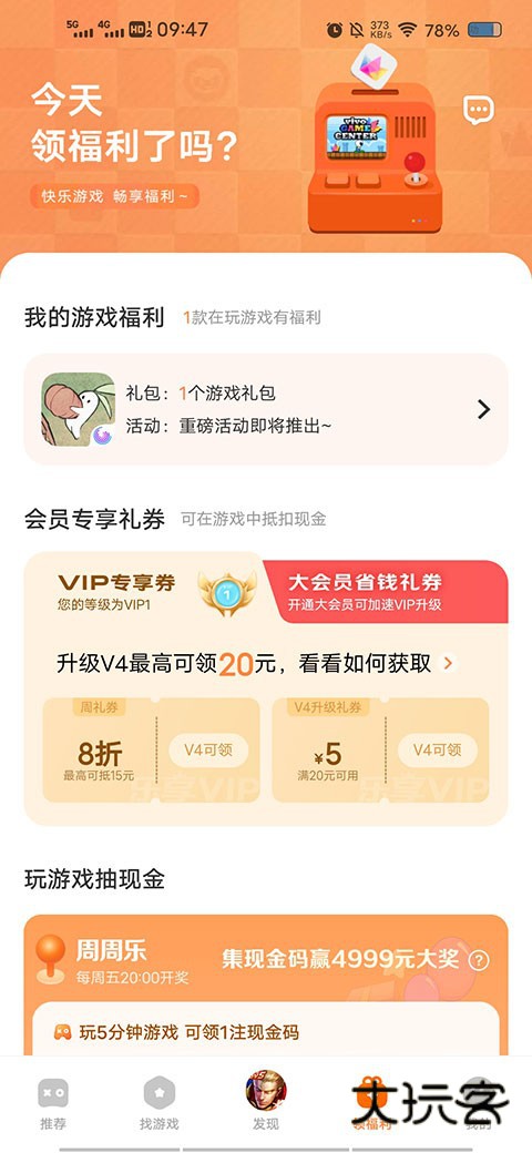 3、在领福利界面,大家可以点击我的游戏福利,领取该游戏的专属福利。