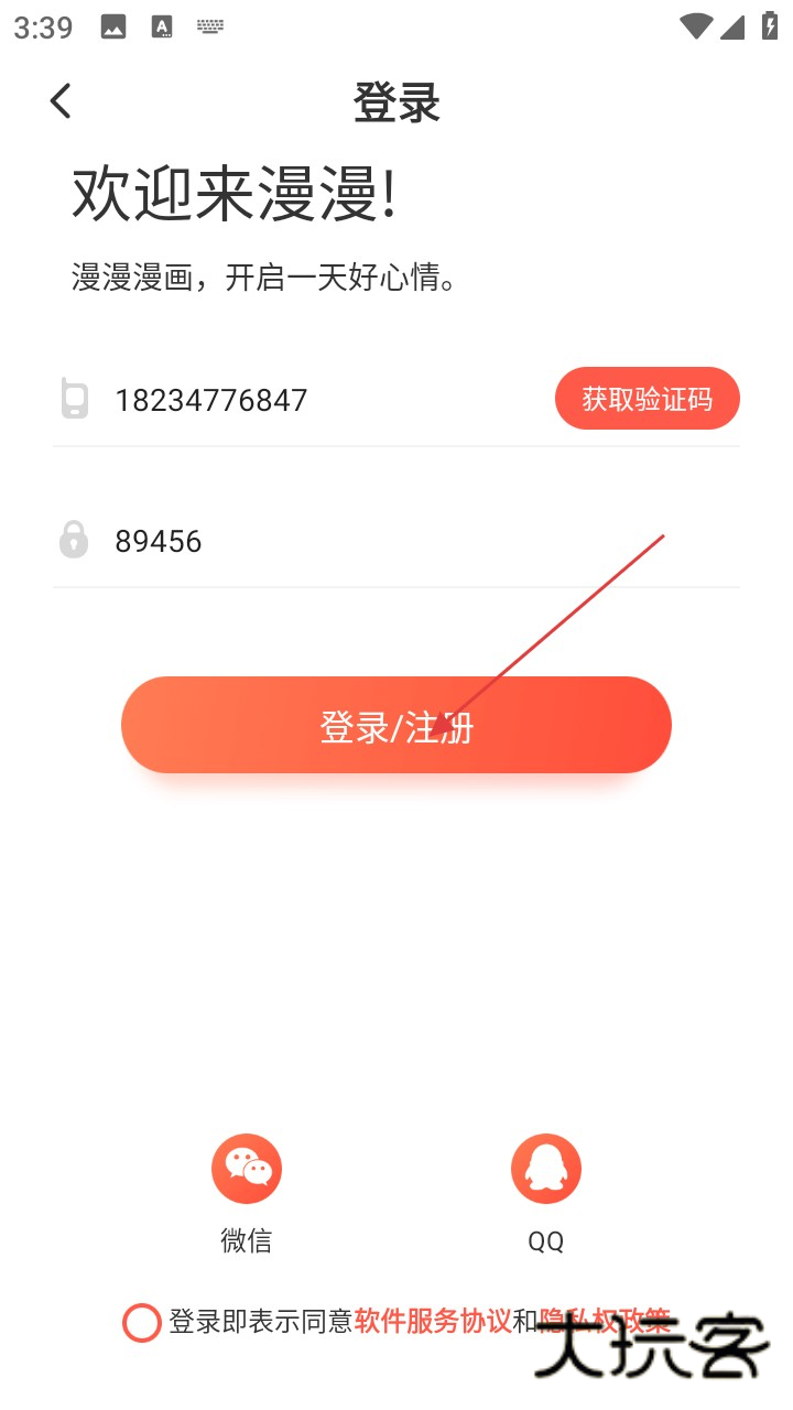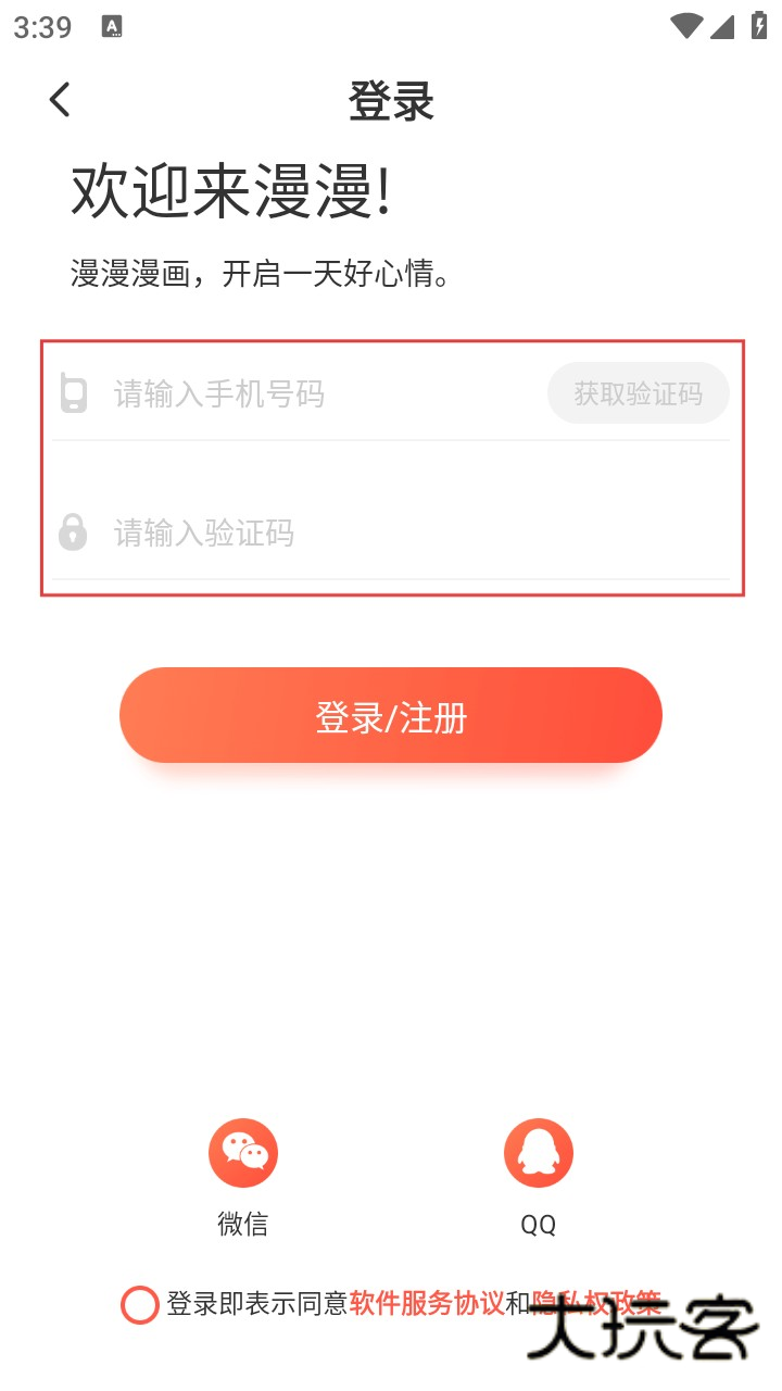 3、进入登录页面后,可选择输入手机号和验证码,或用微信、QQ登录。