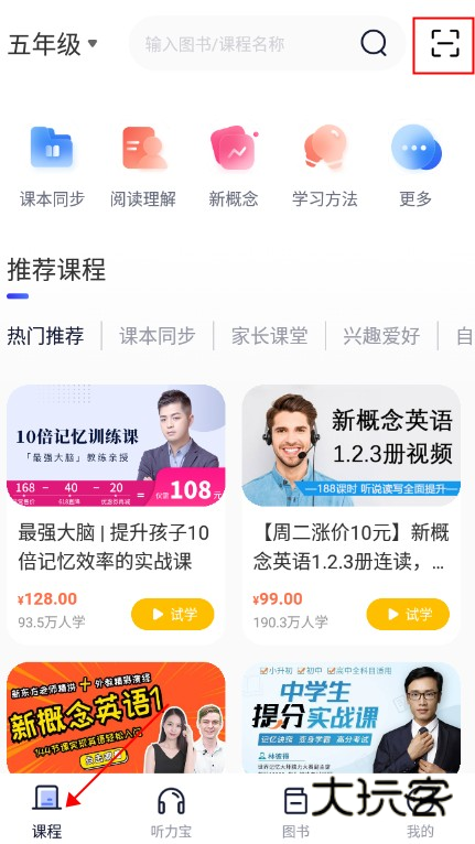 2、菜单栏点击课程,然后点击右上角扫一扫图标。