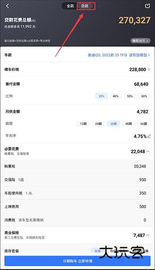 6、最后我们再点击上方的贷款按钮进行切换,在这里我们就能看到分期计算的一些具体金额了。用户还可以对首付比例、月供期限、年利率进行调整,软件会及时计算出相应的首付金额和月供金额。
