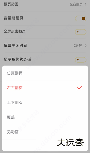 4、进入之后,你会看到翻页动画。“翻页动画”就是阅读时翻页的效果设置,点击进入即可选择。