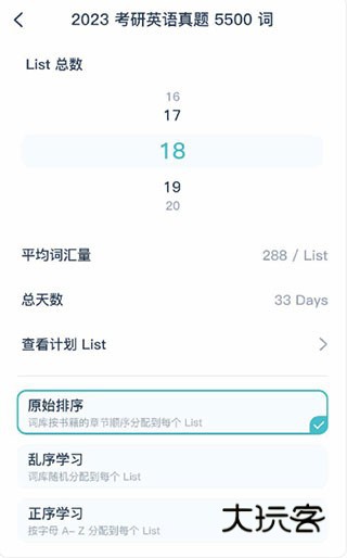 如选择2023考研英语真题5500,进入[学习计划表设置]页面,通过滚动数字轮来调整List总数,把单词词库进行平分,得到平均词汇量和总天数,选择乱序学习,得到你的学习计划表,点击开启你的单词记忆之旅按钮,开始进行单词学习。