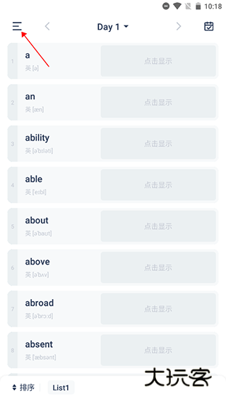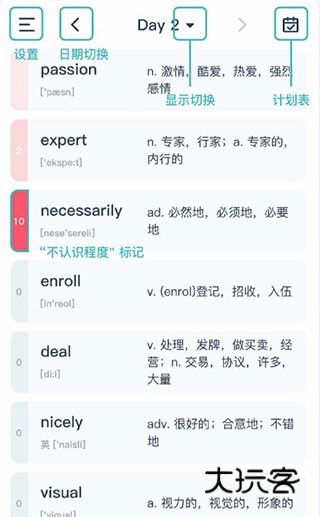 学习页面,进入到Day2,中间显示当前List的所有单词,如图所示: