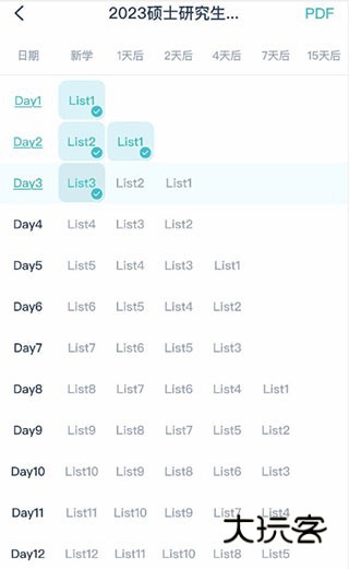 学习计划列表,每个Day的单词学习由记忆和复习两部分组成,当前Day的记忆和复习都完成,才能进入到下一个Day,打勾表示已完成记忆/复习。如下图,Day3已完成了list3的记忆,还要复习list1和list2后,才能进入到Day4的学习。