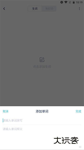 4、进入添加单词界面,输入单词拼写、单词释义,点击【完成】。